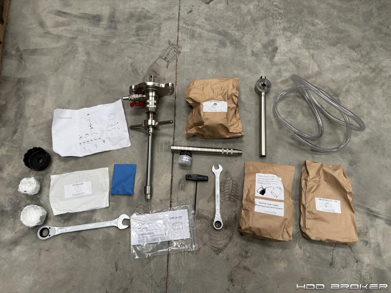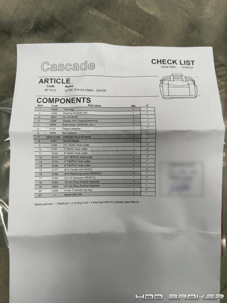 Seller States: Portable drilling kit designed for professional use to install tapping saddles on water and heat networks on Ductile Iron, PE, PVC-O and Fibre Cement pipes at a maximum of 16 bar pressure between 0 degrees Celsius to 100 degree Celsius.